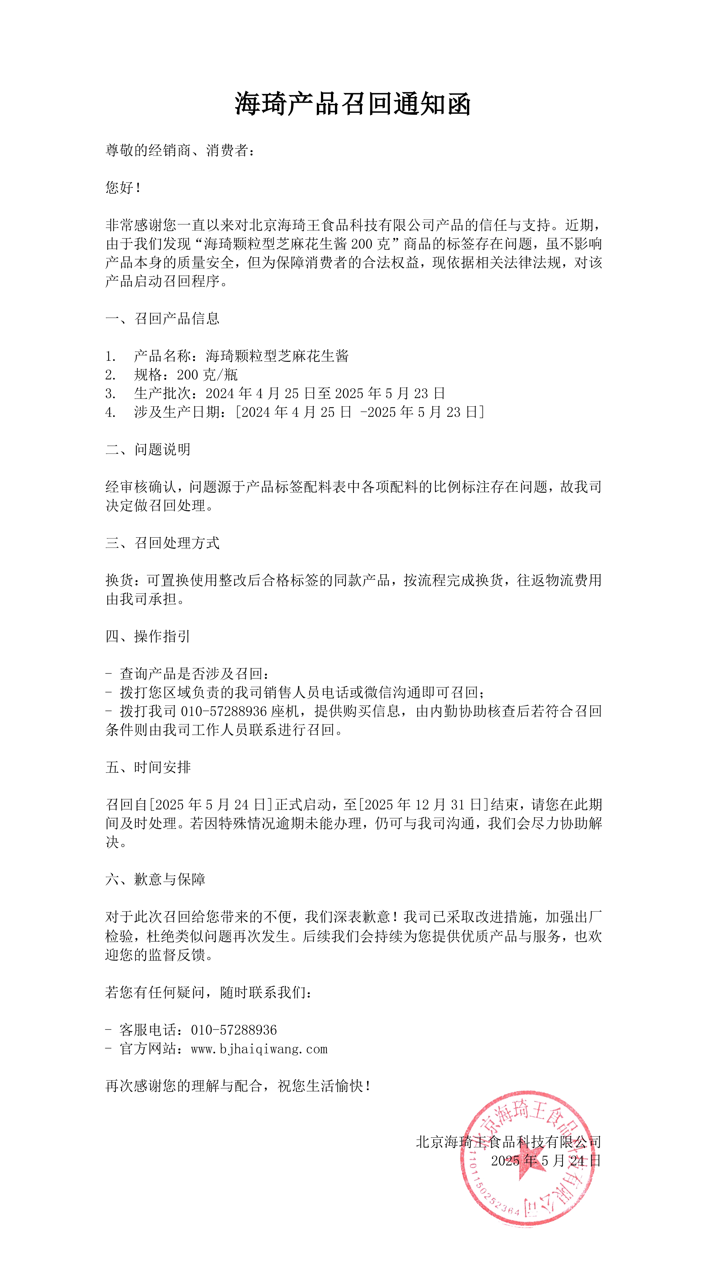 | 海琦產(chǎn)品召回通知函 |